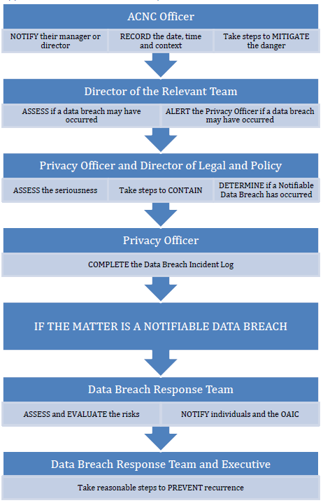 - Once an individual is aware of a suspected data breach, they must immediately notify their director and manager if they are ACNC Staff, or the Privacy Officer if they are the Commissioner, a member of the Advisory Board or an external service provider.