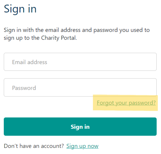 On the Charity Portal sign in page, click 'Sign up now' below the ‘Sign in’ button.