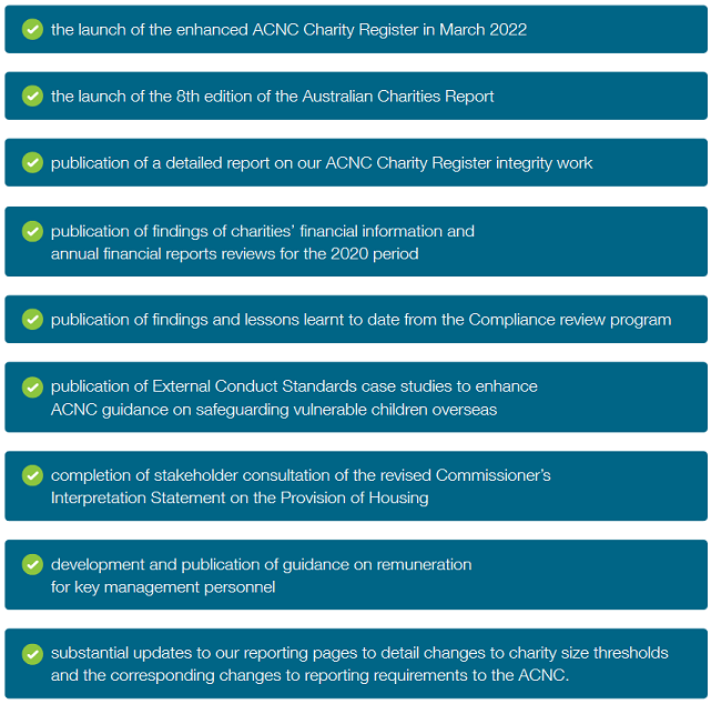 Our dedicated staff have worked hard throughout the year to achieve our priorities as set out in the 2021–22 Corporate Plan. They have also delivered new projects that will help charities and the broader sector.
