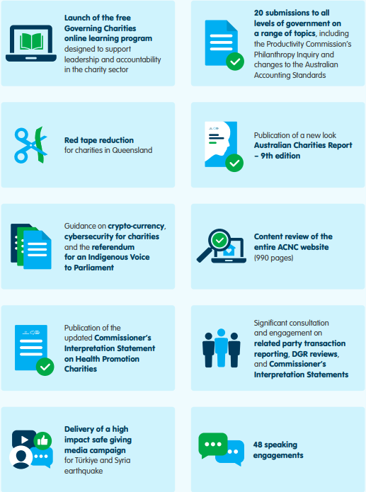 The ACNC Annual Report 2022-23 provides an overview of the Commission's work in the 2022-23 financial year.