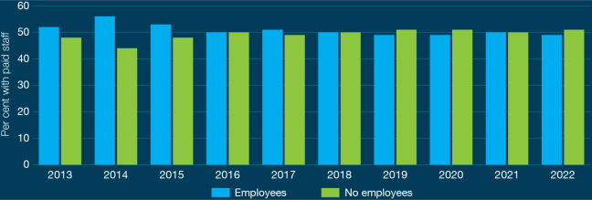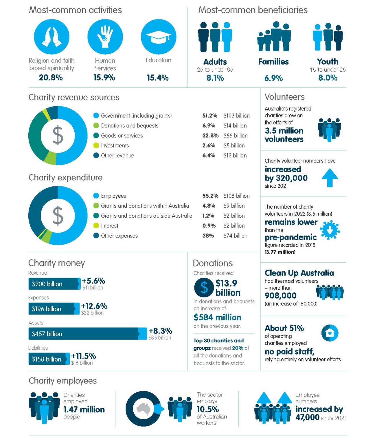 The report indicates charities remain a major employer, accounting for 10.5% of the Australian workforce. Still, the sector continued to depend on volunteers, with more than half of all charities reporting they operate with no paid staff.