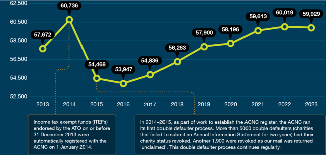- The size of Australia’s charities uses data submitted by 51,536 charities in the 2022 Annual Information Statement. This in an increase from 49,402 charities analysed as part of the 9th edition.