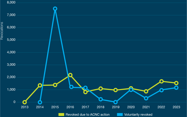 Annual charity registrations vs revocations by financial year