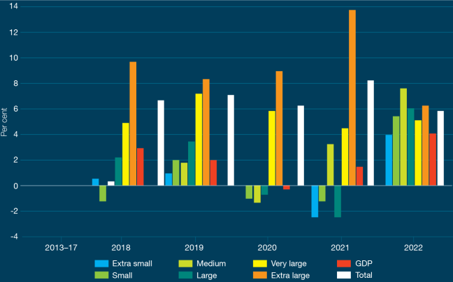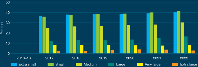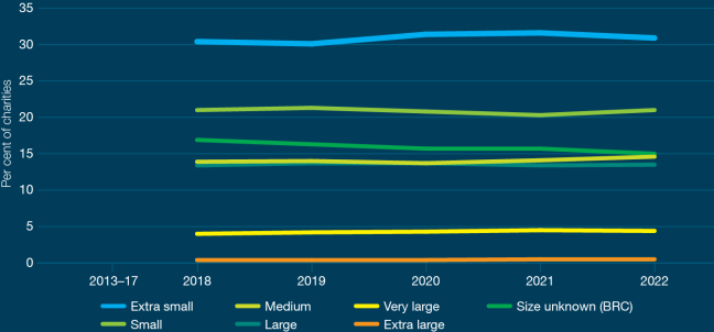 We base our analysis on charity size. The charity size thresholds changed in 2022. Data we have gathered since the change to charity size thresholds shows 74% of charities now report as small, compared to the 65% that did so before the shift. This was a proposal that arose from the ACNC legislation review.