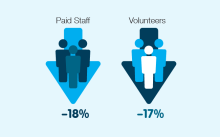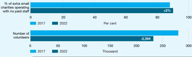 The five-year figures show there was a significant drop in the number of volunteers (-17%) and paid staff (-18%) for extra small charities.