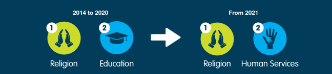 Religion remains the most common activity across the sector, but from 2021 Human Services now exceeds Education as the second-most common activity.