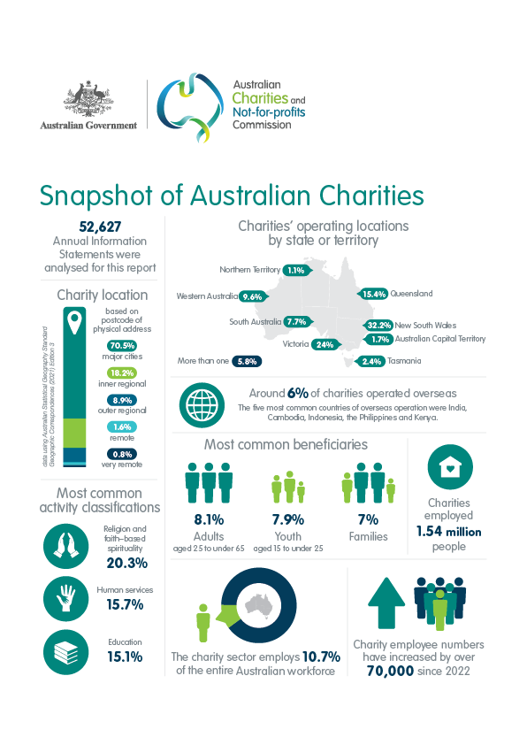 This edition is based on the 52,627 Annual Information Statements submitted by charities to the ACNC for the 2023 reporting period. The number of registered charities continues to grow – with about 1,100 more annual returns included in this analysis.