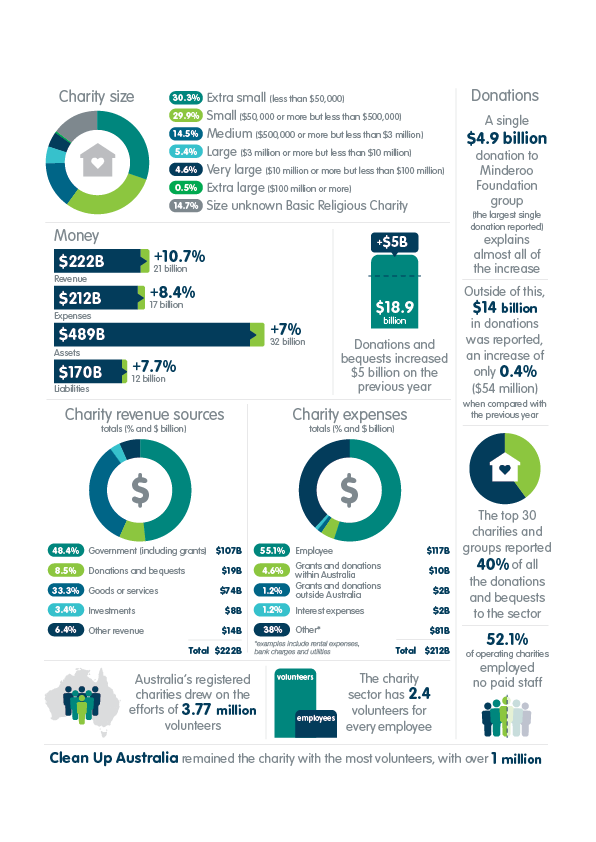 Pleasingly, this 11th edition shows that there has been a significant rebound, with charity revenue reaching a record high of $222 billion – a rise of 10.7%. And, importantly, this increase in revenue was greater than the rise in expenses, which grew 8.4% to $212 billion.