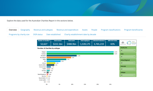 The Australian Charities Report contains comprehensive information from Australia’s registered charities, drawn from their Annual Information Statements.