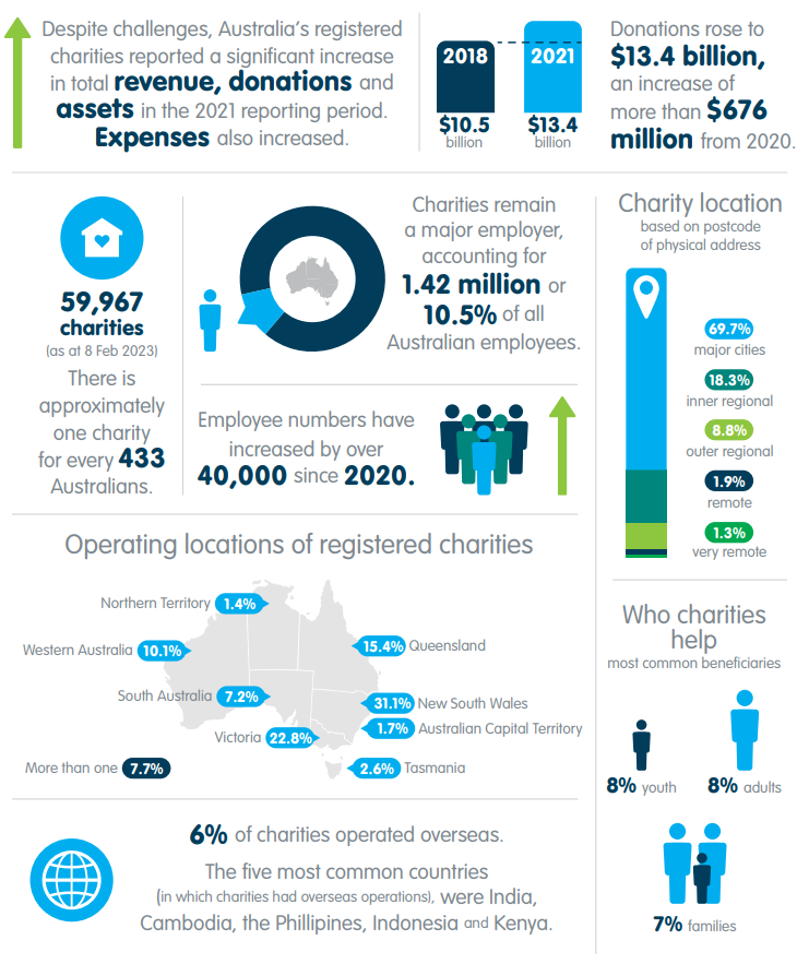 According to the Australian Bureau of Statistics, Australia’s population was 25,978,935 people at 30 June 2022. This equates to approximately one charity for every 433 Australians.