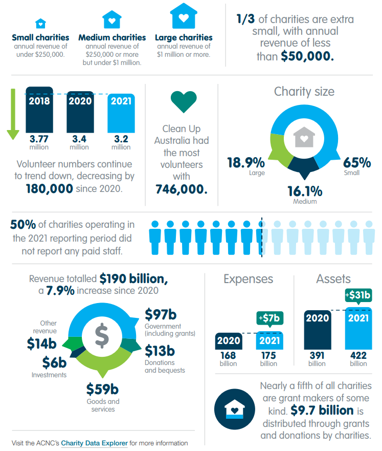 The report is based on the most current data available for Australia’s registered charities and builds on analysis from previous years. For this edition, we looked at the Annual Information Statements of 49,402 charities from the 2021 reporting period.