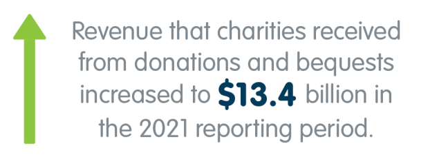 The data also shows that $13.4 billion of charity revenue is made up of donations and bequests, and charities distributed $9.7 billion in grants and donations.